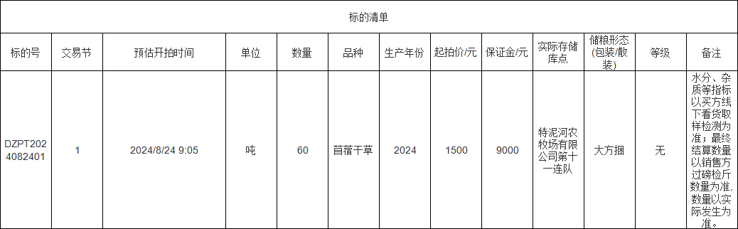 轉讓標的為苜蓿干草60噸,標的存放地位于特泥河農牧場有限公司第十一連隊,詳情見標的清單: