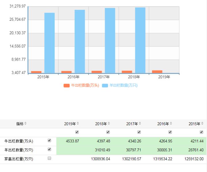 全國2015-2019年牛、羊、豬出欄情況