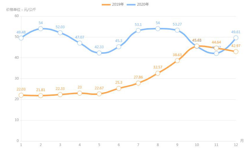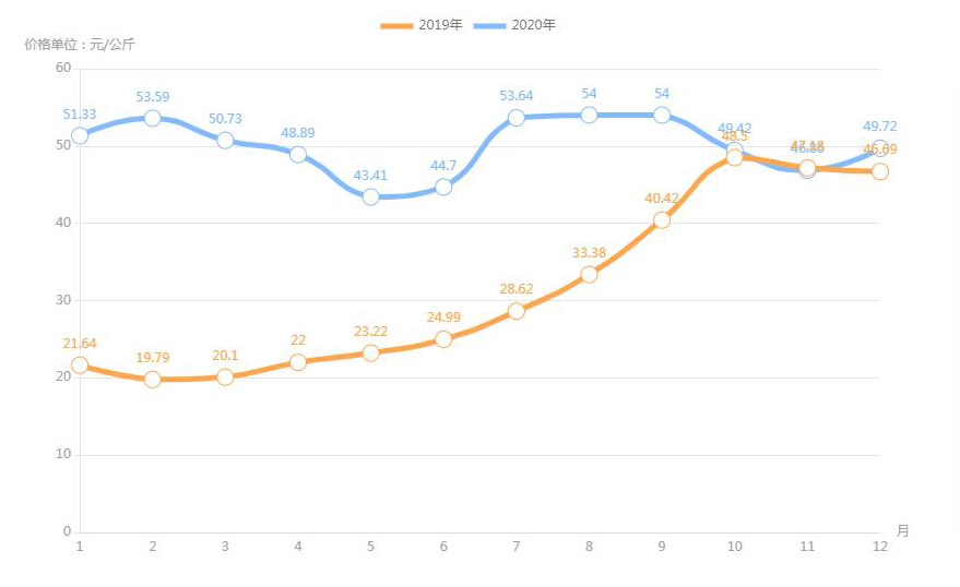 對(duì)內(nèi)蒙古幾大農(nóng)貿(mào)批發(fā)市場(chǎng)羊肉價(jià)進(jìn)行匯總分析得出:呼和浩特市內(nèi)蒙古美通農(nóng)產(chǎn)品批發(fā)市場(chǎng)羊肉最高價(jià)格出現(xiàn)在2020年11月68元/公斤,最低價(jià)格出現(xiàn)在2019年4月52元/公斤。呼和浩特市東瓦窯批發(fā)市場(chǎng)羊肉最高價(jià)格出現(xiàn)在2020年12月73.38元/公斤,最低價(jià)格出現(xiàn)在2019年5月61.08元/公斤。包頭市友誼蔬菜批發(fā)市場(chǎng)羊肉最高價(jià)格出現(xiàn)在2020年12月67.16元/公斤,最低價(jià)格出現(xiàn)在2019年3月54元/公斤。內(nèi)蒙古赤峰西城市場(chǎng)羊肉最高價(jià)格出現(xiàn)在2019年9月75.52元/公斤,最低價(jià)格出現(xiàn)在2019年3月56.97元/公斤。羊肉價(jià)格和去年同期相比整體上漲,漲幅基本在每公斤5-15元左右。