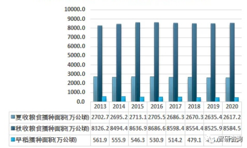2020年全國糧食播種面積17.52億畝,比上年增加1056萬畝,增長0.6%;谷物播種面積14.69億畝,比上年增加176萬畝,增長0.1%;稻谷播種面積4.51億畝,比上年增加573萬畝,增長1.3%;豆類播種面積1.74億畝,比上年增加778萬畝,增長4.7%。受大豆振興計劃政策帶動,大豆播種面積1.48億畝,比上年增加825萬畝,增長5.9%。中國糧食生產(chǎn)再獲豐收,產(chǎn)量連續(xù)6年保持在1.3萬億斤以上,為扎實做好六穩(wěn)工作、全面落實六保任務(wù),為應對復雜多變的國內(nèi)外環(huán)境、克服各種風險挑戰(zhàn),為全面建成小康社會、打贏脫貧攻堅戰(zhàn)提供了堅實的基礎(chǔ)。(數(shù)據(jù)來源:國家統(tǒng)計局、中商產(chǎn)業(yè)研究院整理)