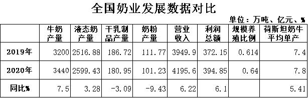 新冠肺炎疫情后,乳業(yè)成為逆勢(shì)增長(zhǎng)的行業(yè)之一,乳企業(yè)績(jī)不斷好轉(zhuǎn),整個(gè)行業(yè)的利潤(rùn)總額同比降幅不斷收窄,10月利潤(rùn)總額增幅由負(fù)轉(zhuǎn)正,今年以來(lái)首次轉(zhuǎn)為正值。隨著消費(fèi)者對(duì)健康飲食更加重視,乳業(yè)的未來(lái)發(fā)展會(huì)更好。根據(jù)國(guó)家統(tǒng)計(jì)局?jǐn)?shù)據(jù),2020年全國(guó)液態(tài)奶產(chǎn)量2599.43萬(wàn)噸,同比增長(zhǎng)3.28%;全國(guó)干乳制品產(chǎn)量180.95萬(wàn)噸,同比下降3.09%;全國(guó)奶粉產(chǎn)量101.23萬(wàn)噸,同比下降9.43%,其中12月份產(chǎn)量10.15萬(wàn)噸,同比下降1.41%。規(guī)模以上乳企主營(yíng)業(yè)務(wù)收入4195.58億元,同比增長(zhǎng)6.22%;利潤(rùn)總額394.85億元,同比增長(zhǎng)6.10%,利潤(rùn)總額增幅轉(zhuǎn)正,銷售利潤(rùn)率9.41%。奶業(yè)轉(zhuǎn)型升級(jí)加快推進(jìn)。全國(guó)奶牛規(guī)模養(yǎng)殖比例達(dá)到64%,同比提高2.6個(gè)百分點(diǎn)。全國(guó)荷斯坦奶牛平均單產(chǎn)超過(guò)7.8噸,同比增長(zhǎng)400千克。