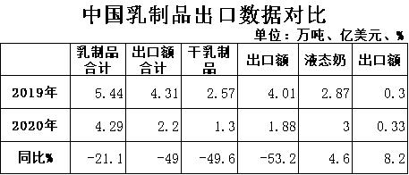 液態(tài)奶:2020年我國(guó)共出口液態(tài)奶3.0萬(wàn)噸,同比增加4.6%,出口額0.33億美元,同比增長(zhǎng)8.2%。