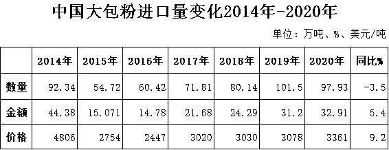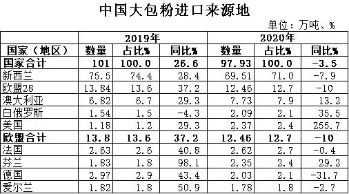 據(jù)中國(guó)海關(guān)統(tǒng)計(jì),2020年進(jìn)口大包粉97.93萬(wàn)噸,同比-3.5%,進(jìn)口額32.91億美元,同比+5.4%,均價(jià)3361美元/噸,同比+9.2%,主要來(lái)自新西蘭占71%、歐盟占12.7%、澳大利亞占7.9%。