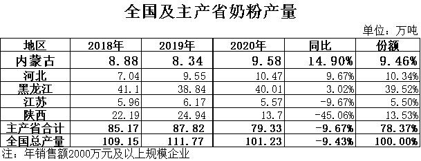 奶粉:根據(jù)國(guó)家統(tǒng)計(jì)局?jǐn)?shù)據(jù),2020年全國(guó)奶粉產(chǎn)量101.23萬(wàn)噸,同比下降9.43%,其中黑龍江產(chǎn)量40.01萬(wàn)噸,同比增長(zhǎng)3.02%,占總產(chǎn)量的39.52%,位居全國(guó)第一位;內(nèi)蒙古產(chǎn)量9.58萬(wàn)噸,同比增長(zhǎng)14.90%,占總產(chǎn)量的9.46%,位居全國(guó)第四位。