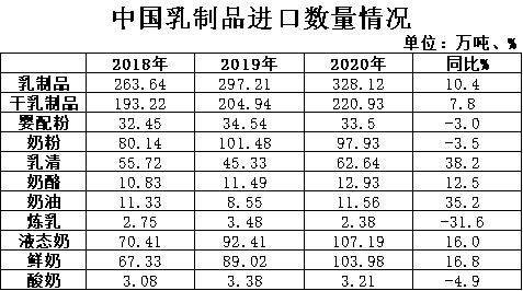 從進(jìn)口的主要品類來(lái)看,大包粉、嬰配粉進(jìn)口量略減,其余多數(shù)品類,尤其是乳清、奶油以及奶酪和包裝牛奶進(jìn)口量大幅增長(zhǎng)。