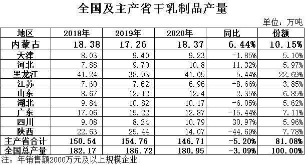 干乳制品:根據(jù)國(guó)家統(tǒng)計(jì)局?jǐn)?shù)據(jù),2020年全國(guó)干乳制品產(chǎn)量180.95萬(wàn)噸,同比下降3.09%,其中12月份產(chǎn)量16.85萬(wàn)噸,同比增長(zhǎng)4.19%。其中黑龍江產(chǎn)量最高,41.05萬(wàn)噸,同比增長(zhǎng)5.44%,占全國(guó)總產(chǎn)量的22.69%位居全國(guó)第一位;內(nèi)蒙古產(chǎn)量19.37噸,同比增長(zhǎng)6.44%,占全國(guó)總產(chǎn)量的10.15%,位居全國(guó)第二位。